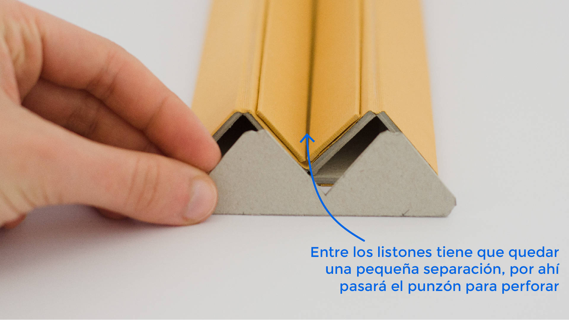 Vamos a continuar pegando los listones, en la siguiente imagen vas a poder ver dónde tienen que queda colocados. Su ubicación va a variar según el material con el que hayas trabajado, por ejemplo un cartón más grueso va a requerir más distancia entre listones para que el punzón tenga lugar para entrar. Es importante que encoles y pegues bien estas piezas. Por último vas a colocar la pieza que cubre el frente de la cuna también con adhesivo vinílico y dejar secar muy bien antes de usar. En la siguiente imagen vas a poder ver a qué separación entre listones me refiero ¡Es muy muy importante la ubicación de estas piezas!